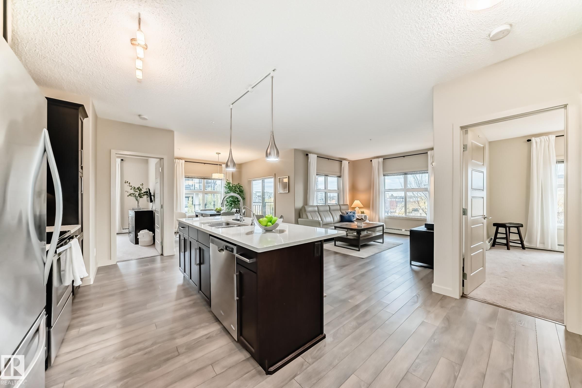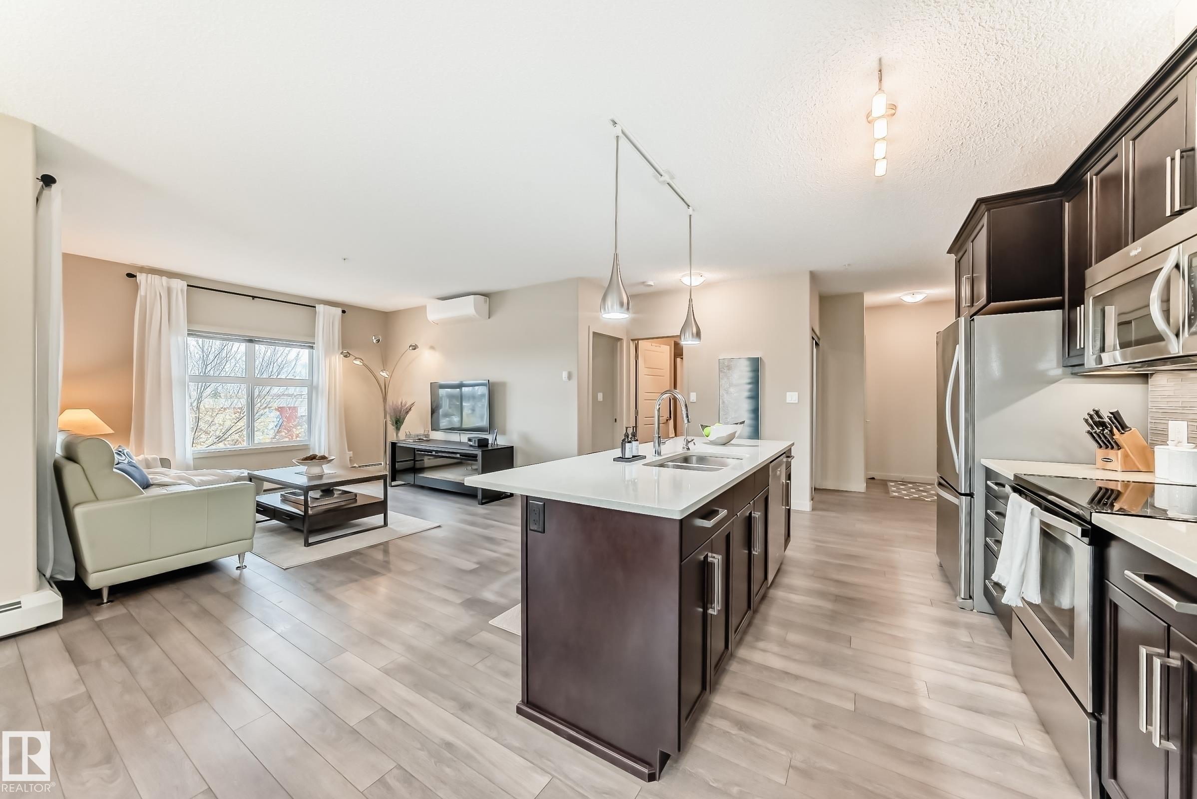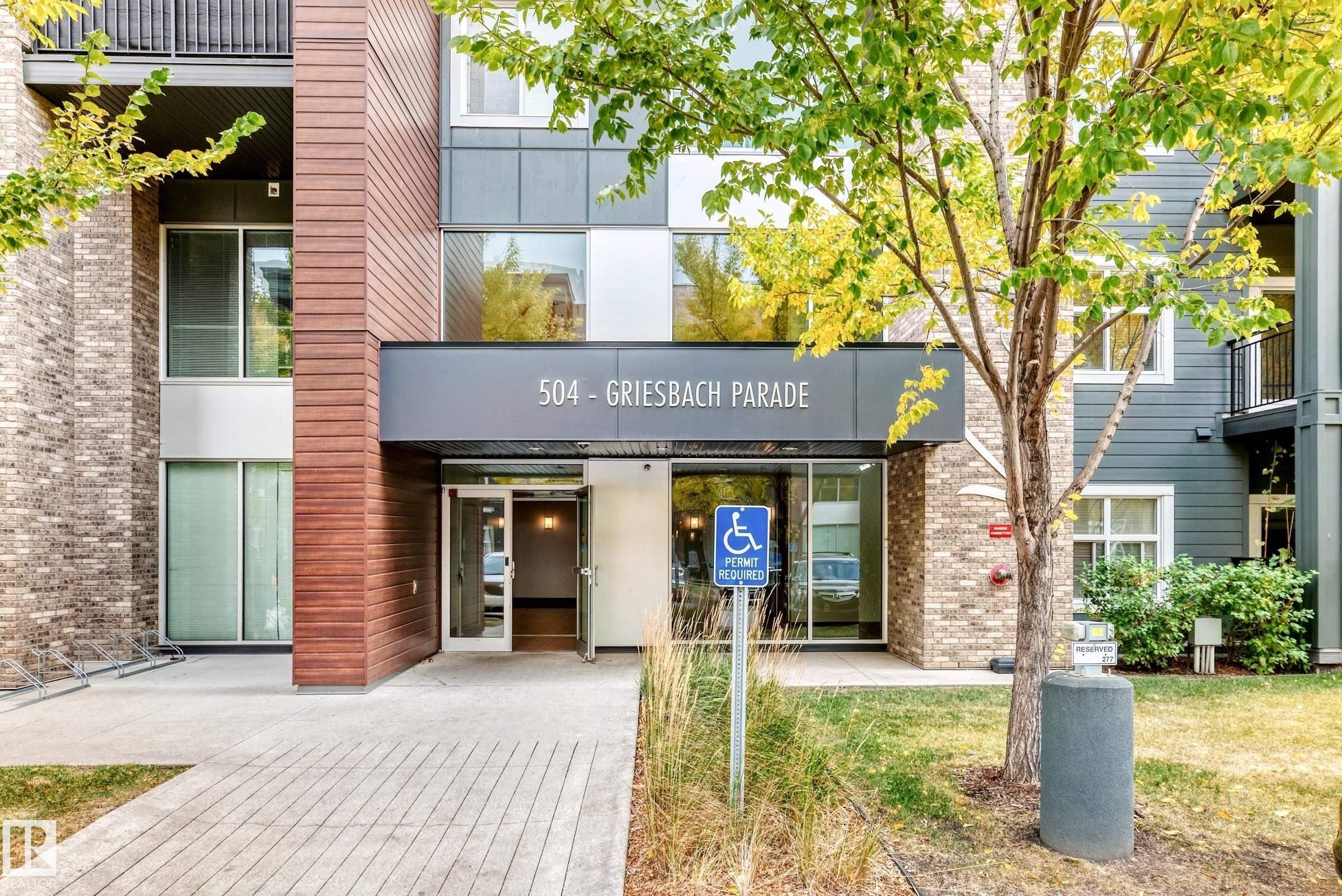 Corner Suite with 2 Beds, 2 Baths + Den, 2 Parkings in Griesbach! Welcome to this impeccably maintained corner unit in one of Edmonton's most desirable communities. This spacious 2-bedroom, 2-bathroom + den home offers modern finishes throughout. Featuring quartz countertops, bar seating, and an open-concept layout, the kitchen flows into bright living and dining areas with access to a large covered balcony--perfect for relaxing or entertaining. Bedrooms are thoughtfully placed on opposite corners for added privacy. The primary suite includes a walk-through closet and spa-inspired ensuite, while the second bedroom sits next to a full 4-piece bath. Extras include A/C, full-size in-suite laundry, TWO titled parking stalls (one underground, one surface; both located next to entrance and elevator), and a secure storage cage in the heated parkade. Located steps from parks, cafes, restaurants, transit, and scenic walking trails, this home offers the ideal blend of urban convenience and neighborhood charm. MLS®: E4462434 - Griesbach Single Level Apartment $339,900